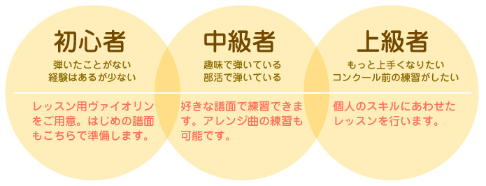ヴァイオリン未経験者や、少しだけさわったこともあるという方も大歓迎です。ヴァイオリンをお持ちでない方には、レッスン用のヴァイオリンをご用意してありますので安心です。